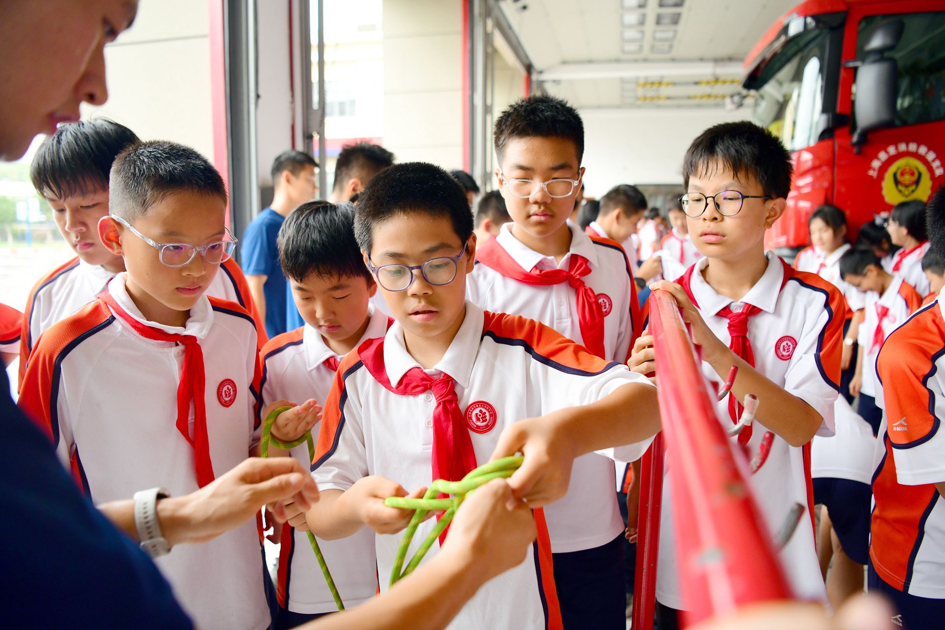 随后,师生们近距离参观消防车,消防员详细介绍了水带、呼吸面罩、担架等装备的功能与使用方法。消防员现场展示的快速穿衣、打结等技能,动作行云流水、一气呵成,引得同学们阵阵惊叹。在互动环节中,同学们更是热情高涨,纷纷亲手体验消防设施的操作,在实践中巩固所学知识。
