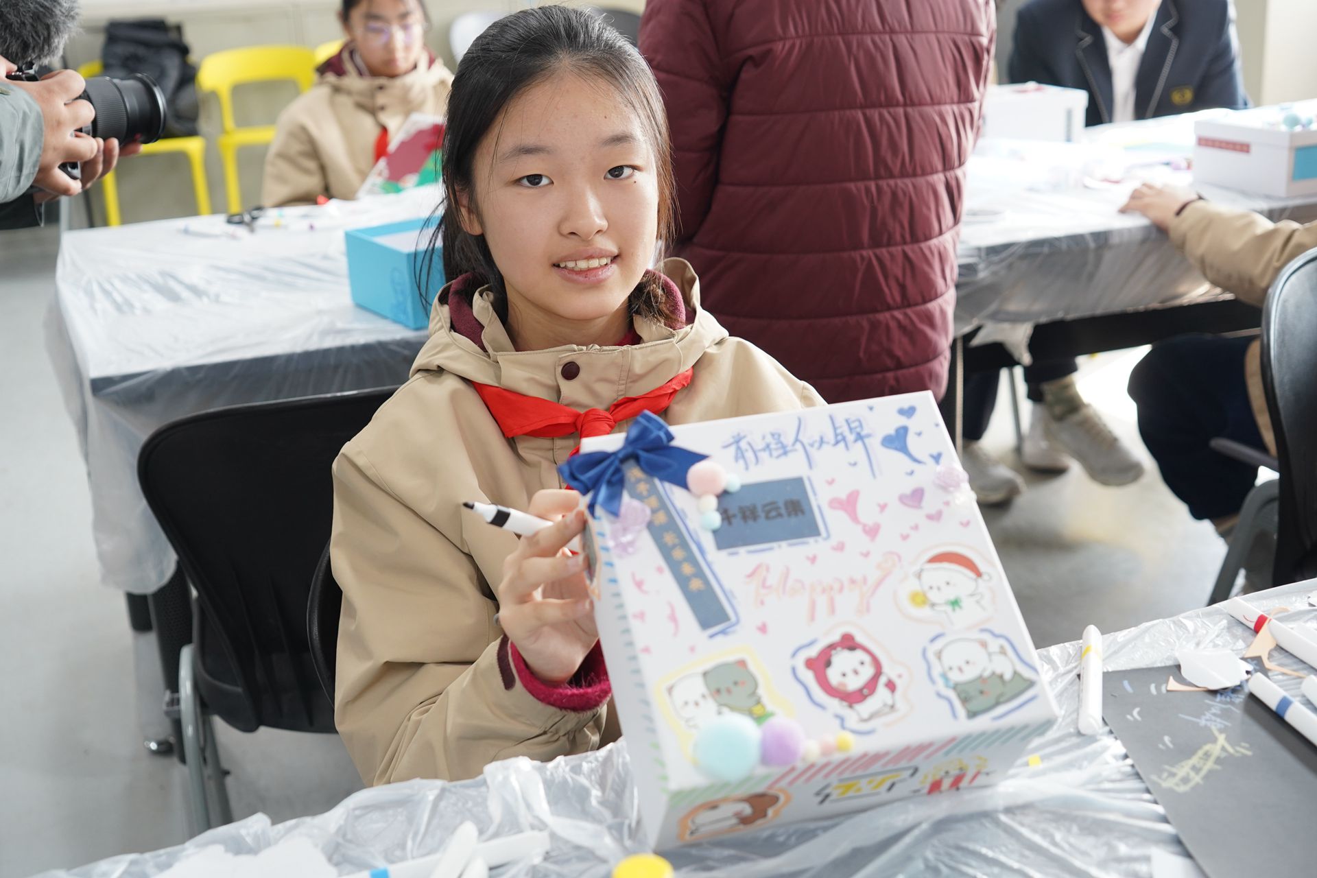在设计环节,同学们脑洞大开:有的以青花瓷纹样为灵感,用马克笔勾勒出典雅的图案;有的结合敦煌壁画元素,剪出精美的镂空造型;还有的巧用环保材料,将废旧卡纸改造为特色包装盒。