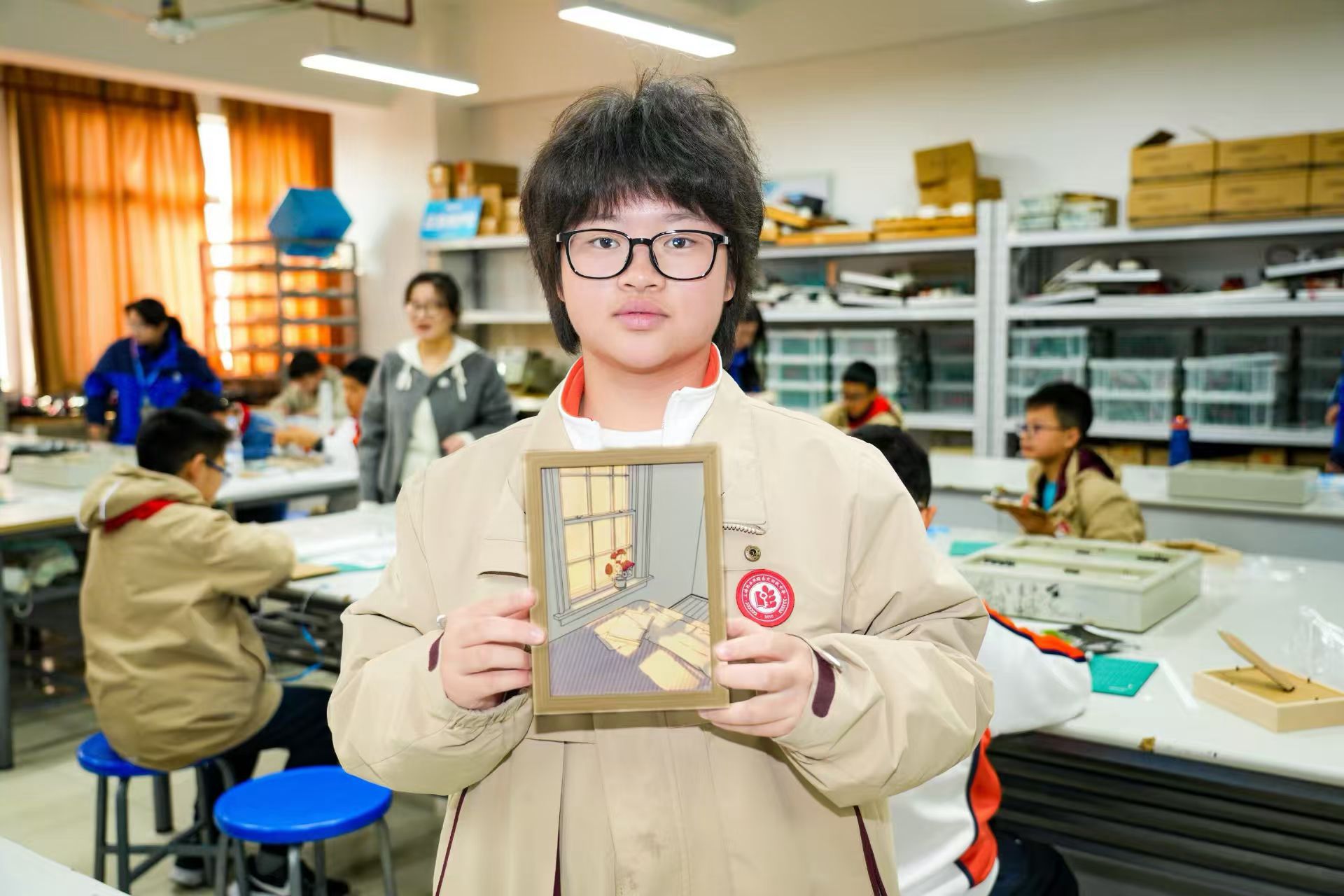 在上海信息技术学校的社会实践里,我们解锁了超神奇的光影画!先看了成品——暖黄的午后阳光像被装进相框里,贼治愈!跟着老师刻纸、叠层、装灯带,大家一边比谁手巧,一边互相搭把手。开背光的瞬间,暖黄“阳光”唰地铺满画面,光斑美炸了!我们直接欢呼起来,这才发现科技和画画凑一块儿能这么妙!——初一(2)班)濮子衿